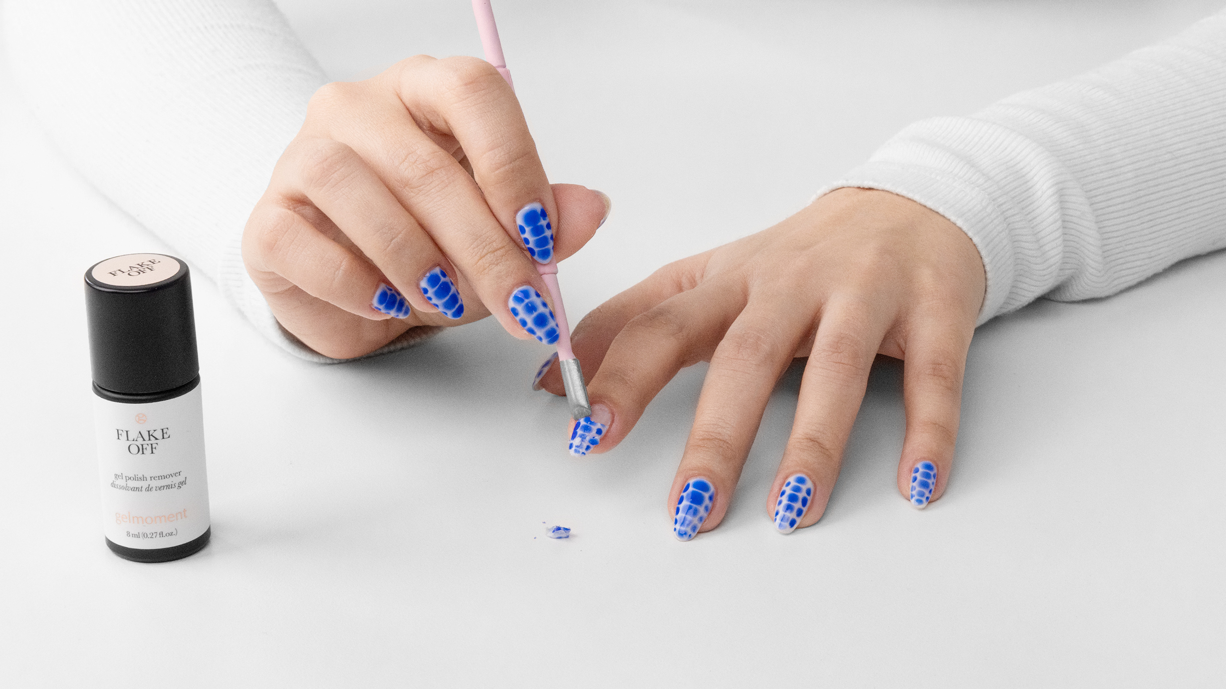 Gently buff shine off polished nails to allow flake off remover to work most effectively.