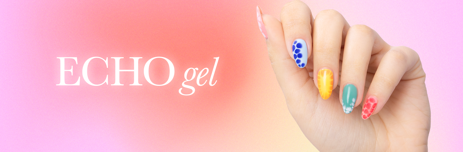 Apply a thin coat of echo gel, and without curing, add any gel polish colours of your choice with a dotting tool or thin brush. Wait for the echoing effect.
